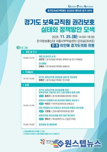 원스텝뉴스 이병희 기자 | 경기도여성가족재단은 오는 25일 오후 2시 한국방송통신대학교 서울서부학습센터에서 ‘경기도 보육교직원 권리보호 실태와 정책방안 모색’을 주제로 정책토론회를 개최한다.