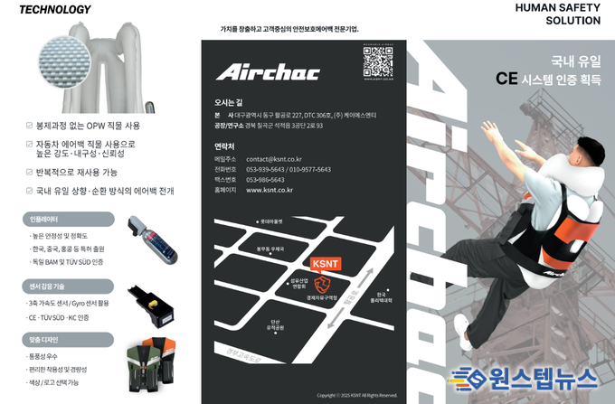 산업안전 솔루션 전문기업 ㈜케이에스엔티(KSNT)는 추락 사고 발생 시 0.2초 이내에 에어백을 팽창시켜 인체를 보호하는 웨어러블 에어백 ‘에어착(Airchac)’의 성능을 대폭 개선한 신제품을 선보이며 산업 안전망 구축에 나섰다고 24일 밝혔다.