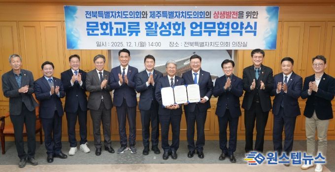 원스텝뉴스 이병희 기자 | 전북특별자치도의회와 제주특별자치도의회는 문화·관광·세계유산 분야 협력을 강화하기 위해 1일 전북도의회 의장실에서 문화교류 활성화 업무협약(MOU)을 체결했다.