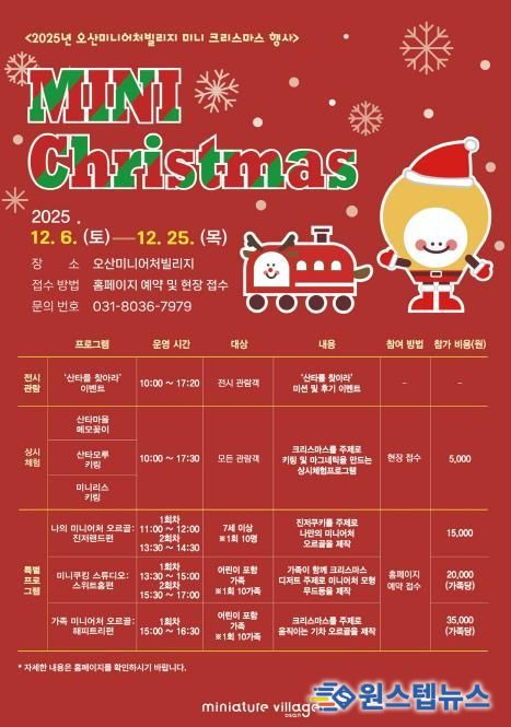 오산미니어처빌리지 관계자는 “남녀노소 누구나 참여할 수 있는 다양한 크리스마스 프로그램을 준비했다”며 “많은 시민과 관광객들이 방문해 따뜻한 연말 분위기 속에서 즐거운 시간을 보내길 바란다”고 말했다.