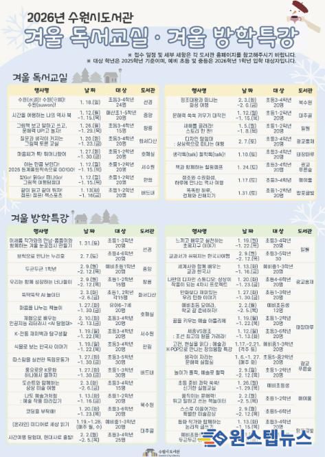 수원시도서관 관계자는 “겨울방학 동안 아이들이 책과 가까워지고 다양한 경험을 쌓을 수 있도록 프로그램을 준비했다”며 “도서관이 배움과 휴식이 공존하는 공간이 되길 바란다”고 말했다.