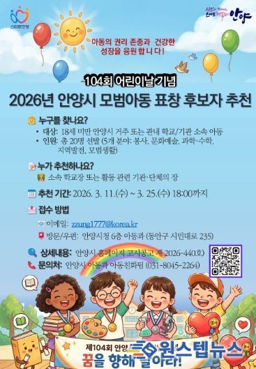 원스텝뉴스 이병희 기자 | 안양시는 어린이날을 맞아 다양한 분야에서 모범이 되는 아동을 발굴하기 위해 ‘2026년 모범아동 유공 표창’ 후보자를 11일부터 25일까지 추천받는다고 11일 밝혔다.