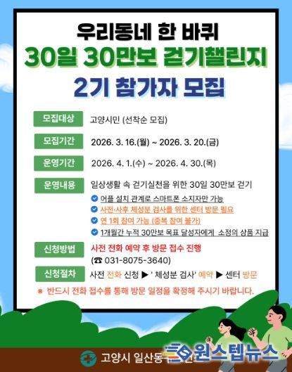 원스텝뉴스 이병희 기자 | 고양특례시 일산동구보건소는 지역 주민의 기초 체력 증진과 일상 속 신체활동 활성화를 위해 ‘우리동네 한 바퀴 30일 30만보 걷기 챌린지’ 2기 참가자를 오는 16일부터 모집한다고 11일 밝혔다.