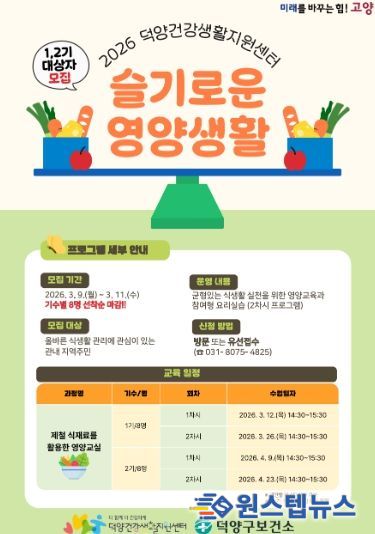 원스텝뉴스 이병희 기자 | 고양특례시 덕양구보건소 덕양건강생활지원센터는 지역주민의 건강한 식생활 실천을 돕기 위해 영양교육과 요리실습을 결합한 프로그램 ‘슬기로운 영양생활’ 1·2기 참여자를 모집한다.