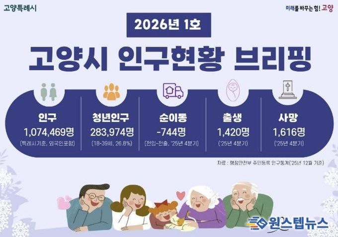 원스텝뉴스 이병희 기자 | 고양특례시가 저출생·고령화 등 급변하는 인구구조 변화에 선제적으로 대응하기 위해 ‘고양시 인구현황 브리핑’을 운영한다. 시는 인구 규모와 연령구조, 출생·사망, 인구이동 등 주요 지표를 행정동 단위까지 세분화해 인포그래픽으로 시각화하고, 이를 시청 홈페이지 행정자료방을 통해 정례적으로 공개할 계획이다.