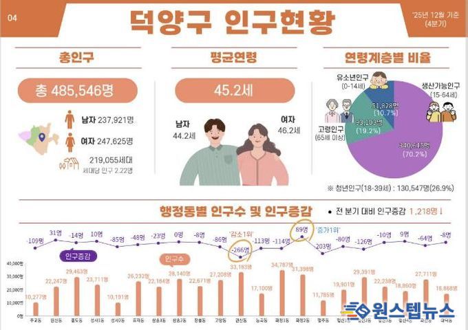 행정동별로 인구규모와 연령구조, 세대 구성, 인구 증감 양상도 서로 다르게 나타났다. 일산동구 장항1동과 덕양구 대덕·효자동은 청년·신혼부부 유입으로 비교적 젊은 인구구조를 보이는 반면, 덕양구 관산·주교동과 일산동구 고봉동은 고령인구 비중이 높아 돌봄·의료·복지 수요가 빠르게 증가하는 등 지역 간 인구구조 격차가 확대되고 있다.