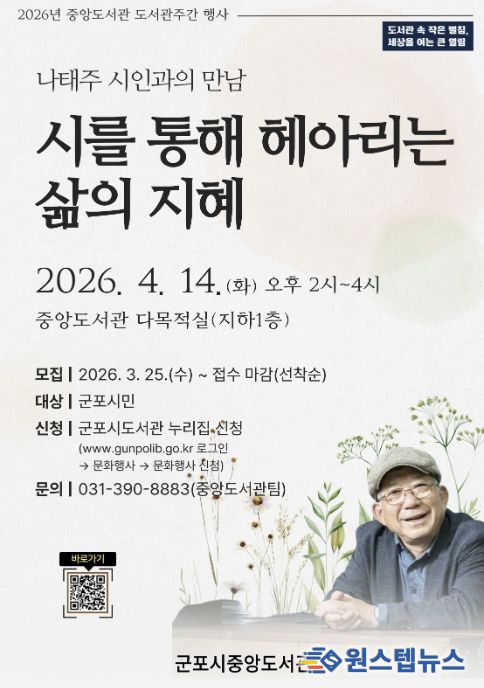원스텝뉴스 이병희 기자 | 군포시중앙도서관은 제62회 도서관주간을 맞아 시민들이 시를 통해 삶의 여유와 위로를 느낄 수 있도록 나태주 시인과 함께하는 특별 프로그램을 운영한다.