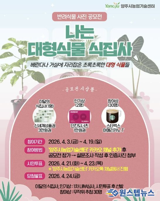 원스텝뉴스 이병희 기자 | 양주시농업기술센터가 시민과 함께하는 도시농업 문화 확산을 위해 ‘2026년 반려식물 사진 공모전’4월 참여자를 모집한다.