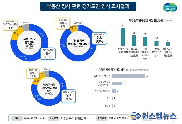 원스텝뉴스 이병희 기자 | 경기도민의 78%는 현재 부동산 시장의 불법행위를 심각하게 인식하고 있으며 경기도 차원의 단속 강화 필요성에는 90% 도민이 공감한다는 조사결과가 나왔다.