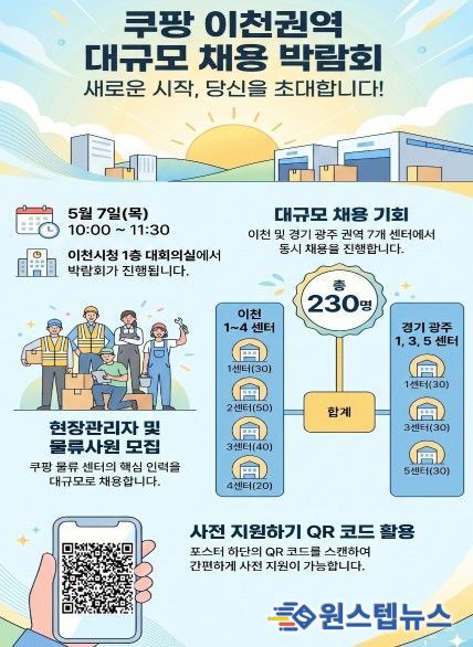 원스텝뉴스 이병희 기자 | 이천시는 오는 5월 7일 오전 10시부터 11시 30분까지 이천시청 1층 대회의실에서 ‘쿠팡 이천권역 대규모 채용 박람회’를 개최한다.