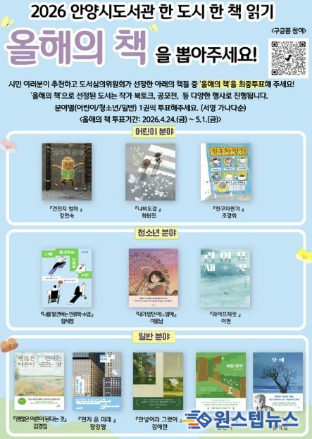 원스텝뉴스 이병희 기자 | 안양시는 2026년 한 도시 한 책 읽기 ‘올해의 책’ 선정을 위한 시민 선호도 조사를 오는 5월 1일까지 온·오프라인으로 진행한다고 24일 밝혔다.