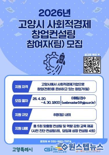 원스텝뉴스 이병희 기자 | 고양산업진흥원이 운영하는 고양시사회적경제지원센터가‘2026년 고양시 사회적경제 창업컨설팅 사업’에 참여할 예비 창업자(팀)을 오는 30일까지 모집한다.