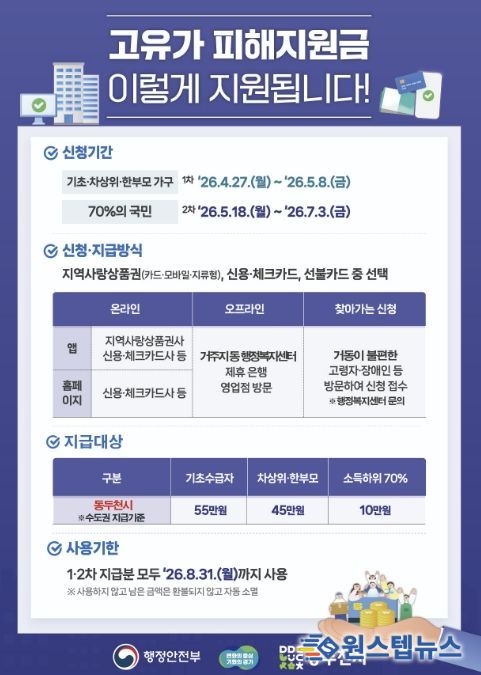 시 관계자는 “이번 고유가 피해지원금이 어려운 경제 여건 속에서 시민 생활 안정에 실질적인 도움이 되길 기대한다”라며 “지역 내 소비 촉진을 통해 소상공인에게도 도움이 될 수 있도록 신속하고 체계적으로 지원하겠다”라고 말했다.