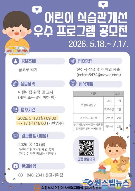 원스텝뉴스 이병희 기자 | 의정부시가 운영하는 의정부시 어린이‧사회복지급식관리지원센터는 어린이 보육시설을 대상으로 5월 18일부터 7월 17일까지 ‘어린이 식습관 개선 우수 프로그램 공모전’을 개최한다.