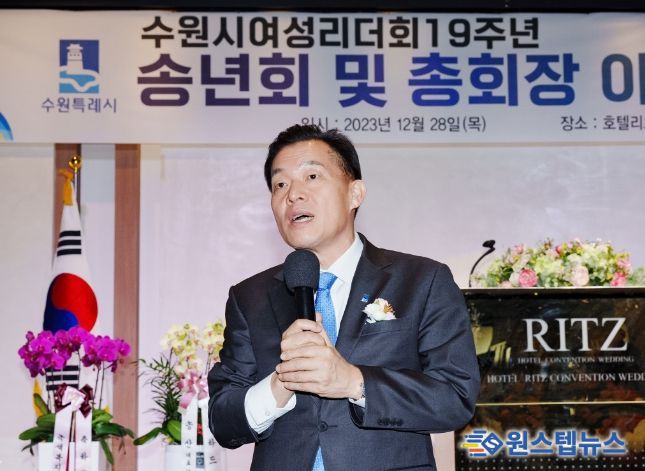 원스텝뉴스 천수호 기자 | 이재준 수원특례시장이 28일 호텔리츠컨벤션웨딩에서 열린 수원시여성리더회 송년 행사에 참석해 “지역사회를 위해 꾸준히 봉사하며 행복한 사회를 만드는 뜻깊은 일에 발걸음을 내디뎌주신 수원시여성리더회에 감사드린다”고 말했다.