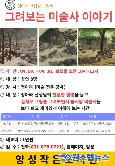 원스텝뉴스 천수호 기자 | 안성시 양성작은도서관은 3월 13일부터 체험형 인문학 프로그램 ‘그려보는 미술사 이야기’의 참가자를 모집한다.