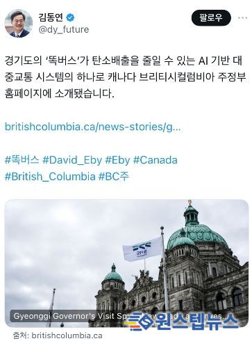 김동연 경기도지사는 22일 자신의 누리소통망(SNS)에 “경기도의 ‘똑버스’가 탄소배출을 줄일 수 있는 AI기반 대중교통 시스템의 하나로 캐나다 브리티시컬럼비아 주정부 홈페이지에 소개됐다”며 링크를 공유했다.