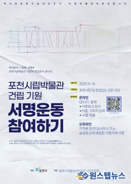 원스텝뉴스 이병희 기자 | 포천시는 오는 6월 말까지 시민과 함께하는 ‘포천시립박물관 건립 기원 시민 서명운동’을 개최한다.