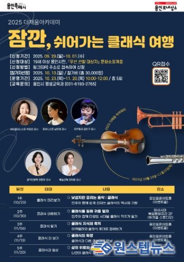 원스텝뉴스 천규영 기자 | 용인특례시는 ‘더채움 아카데미’의 일환으로 마련된 ‘잠깐, 쉬어가는 클래식 여행’ 과정에 참여할 시민 40명을 모집한다고 24일 밝혔다.