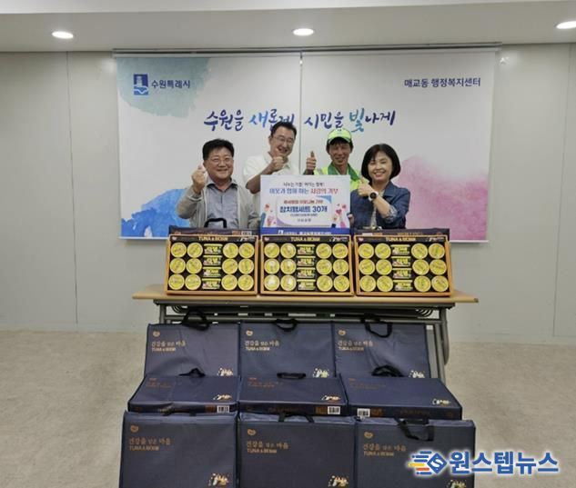 원스텝뉴스 이병희 기자 | 수원시 팔달구 매교동 관내 청소업체인 ㈜대일실업은 지난 22일 수원시 팔달구 매교동행정복지센터에 관내 어려운 이웃에게 100만원 상당의 추석명절 참치햄 선물세트 30개를 기부하여 따뜻한 이웃 나눔을 실천했다.