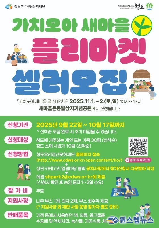 원스텝뉴스 이병희 기자 | 청도우리정신문화재단은 오는 11월 1~2일 토요일 일요일 양일간, 청도 새마을운동발상지기념공원 일원에서 개최되는 ‘2025 가치모아 새마을 플리마켓’의 셀러(판매자) 참가자를 모집한다고 밝혔다.