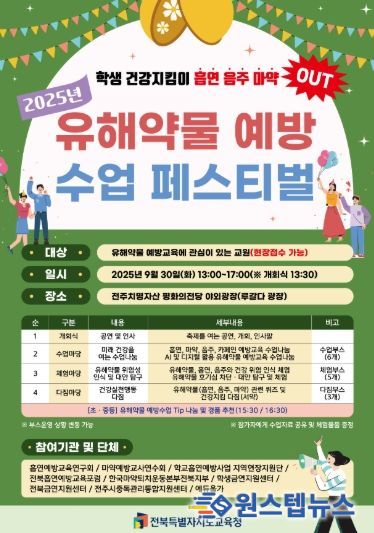 전북교육청은 오는 30일 전주 치명자산 평화의전당 야외광장에서 ‘2025. 유해약물 예방 수업 페스티벌’을 개최한다고 24일 밝혔다.