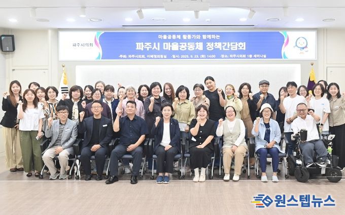 원스텝뉴스 이병희 기자 | 파주시의회 이혜정 의원은 23일 파주시의회 1층에서 ‘마을공동체 활동가와 함께하는 정책간담회’를 개최했다. 이번 간담회는 마을공동체 활동 활성화와 활동가 권익 향상을 위한 행정적 지원, 정책 개선 및 관련 조례 개정 방안을 논의하고 향후 발전 방향을 모색하기 위해 마련됐다.