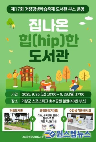 원스텝뉴스 이병희 기자 | 거창군립한마음도서관과 경상남도교육청 거창도서관은 오는 26일부터 28일까지 3일간 거창군 스포츠파크 일원에서 개최되는 제17회 거창평생학습축제 동안 『집나온 힙(hip)한 도서관』 부스를 운영한다고 밝혔다.