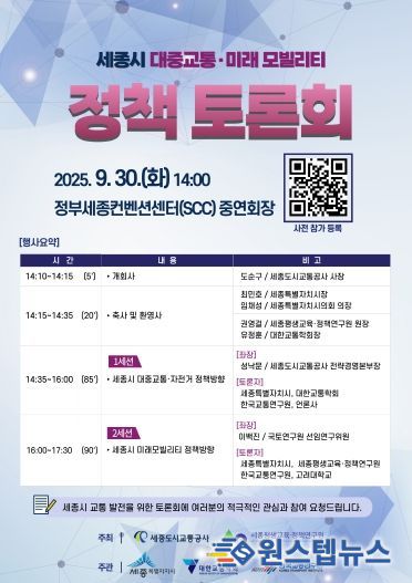 원스텝뉴스 이병희 기자 | 세종도시교통공사(사장 도순구)는 세종평생교육·정책연구원(원장 권영걸)과 함께 9월 30일(화) 14시부터 정부세종컨벤션센터에서 '세종시 대중교통․미래모빌리티 정책 토론회'를 개최한다고 밝혔다.