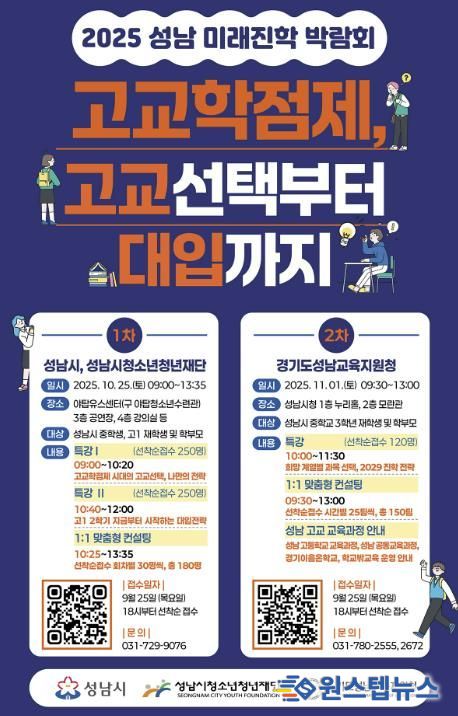 원스텝뉴스 천규영 기자 | 성남시청소년청년재단과 경기도성남교육지원청은 2025년 고교학점제 전면 시행에 따라 변화하는 교육과정과 진학제도에 대한 정확한 정보를 제공하기 위해 ‘2025 성남 미래진학박람회’를 개최한다.