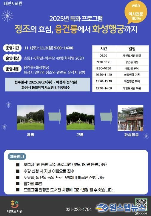 원스텝뉴스 이병희 기자 | 화성시문화관광재단 태안도서관은 오는 2025년 11월 1일부터 2일까지 이틀간 초등학생 1~6학년과 학부모를 대상으로 특별한 역사 체험 프로그램인 ‘정조의 효심, 융건릉에서 화성행궁까지’ 정조 관련 유적지 탐방 프로그램을 운영한다.