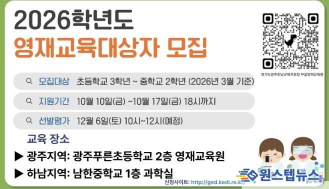 원스텝뉴스 이병희 기자 | 경기도광주하남교육지원청이 2026학년도 부설영재교육원 영재교육대상자 선발을 시작한다. 지원서 접수는 10월 10일부터 진행되며, 대상은 접수일 기준 광주·하남 지역의 초등학교 2학년부터 중학교 1학년까지다.