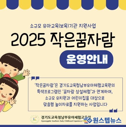 원스텝뉴스 이병희 기자 | 경기도교육청남부유아체험교육원이 소규모 유치원과 어린이집을 대상으로 맞춤형 놀이자료 지원 프로그램 ‘2025 작은꿈자람’을 운영한다.