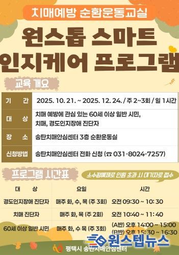 현재 4기 참여자에 대한 접수를 받고 있으며, 신청 대상은 치매 고위험군뿐 아니라 치매 예방에 관심 있는 만 60세 이상 주민 누구나 가능하다. 참여 희망자는 송탄치매안심센터로 문의하면 된다.