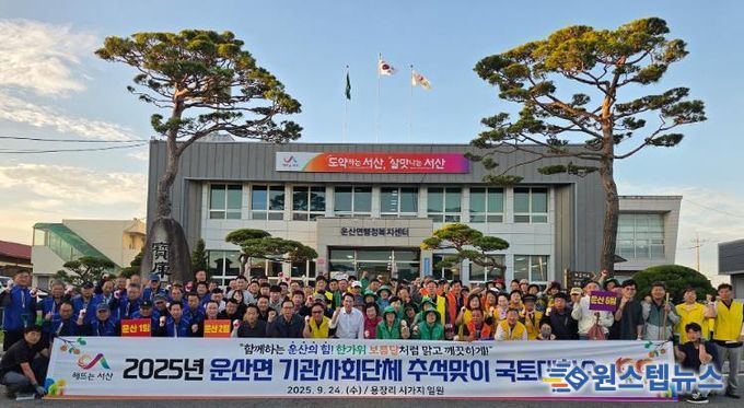 원스텝뉴스 이병희 기자 | 충남 서산시 운산면은 9월 24일 오전 7시경부터 용장리 시가지 일원에서 운산면 15개 기관·사회단체와 공무원 등 130여 명이 참석한 가운데 추석맞이 국토대청소를 실시했다고 밝혔다.