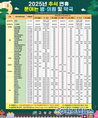 한편, 연휴 중 각종 불편사항 신고는 고성군청 당직실로 연락하면 된다.