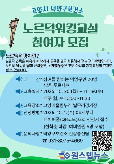 원스텝뉴스 이병희 기자 | 고양특례시 덕양구보건소는 지역 주민의 비만예방관리 및 신체활동 활성화를 위해 오는 10월 20일부터 11월 19일까지 ‘노르딕워킹교실’을 운영한다고 밝혔다.