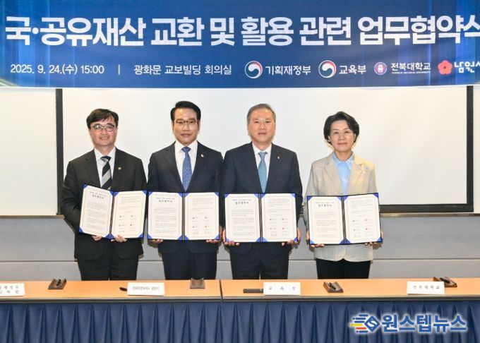 남원시는 오는 9월 24일 오후 3시, 서울 광화문 교보빌딩 20층 회의실에서 열린 '2025년 중앙·지방간 국유재산 정책협의회'에서 기획재정부(제2차관 임기근)·교육부(차관 최은옥)·전북대(총장 양오봉)와 함께 부지교환 업무협약(MOU)을 체결했다고 밝혔다.