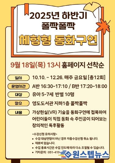 원스텝뉴스 이병희 기자 | 부산 영도도서관이 2025년 하반기 동안 아이들을 위한 특별한 독서 문화 프로그램, ‘폴짝폴짝 체험형 동화구연'을 운영한다.