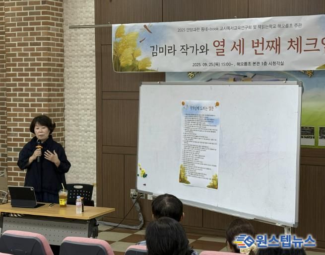 원스텝뉴스 이병희 기자 | 안양과천 동네-book 교사 독서 교육연구회는 9월 25일 안양 해오름초등학교 1층 시청각실에서 독서 교육연구회 회원 및 안양, 군포 관내 희망 교직원들을 대상으로 ‘열두 번째 체크인’으로 알려진 김미라 작가와의 만남을 가졌다.