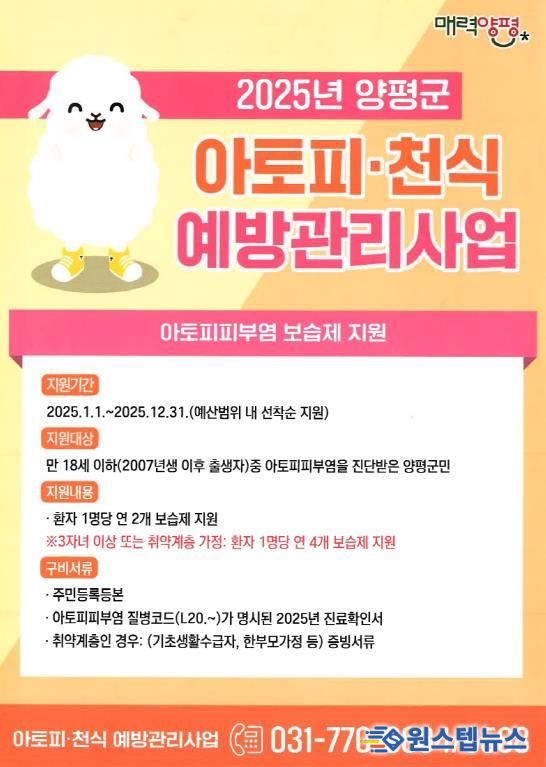 원스텝뉴스 이병희 기자 | 양평군은 지역사회 중심의 알레르기질환 조기 발견과 적절한 치료를 위해 2025년 연중 ‘아토피 피부염 보습제 지원’과 ‘취약계층 알레르기질환 의료비 지원’을 실시한다고 밝혔다.