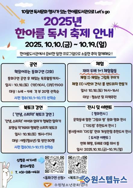원스텝뉴스 천규영 기자 | 수원시청소년청년재단 수원청소년문화센터 한아름도서관은 2025. 독서의 달을 기념하여‘한아름독서축제’를 10월 10일부터 10월 19일까지 운영한다.