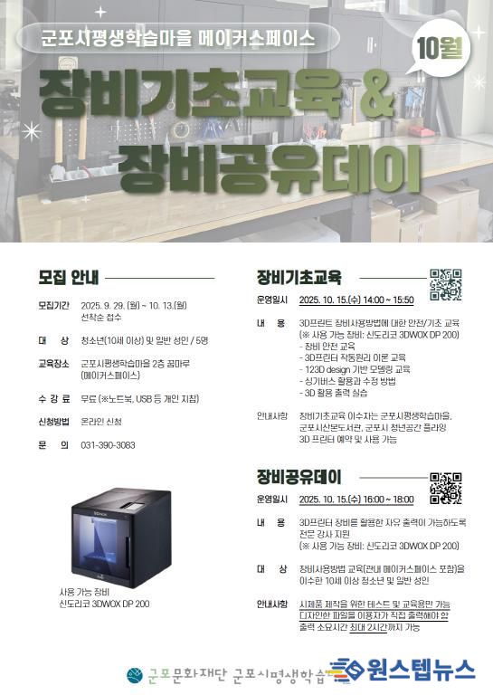 원스텝뉴스 이병희 기자 | (재)군포문화재단은 오는 10월 15일, 지역 청소년과 성인을 대상으로 디지털 제작 장비를 활용한 ‘3D프린터 장비기초교육’과 ‘장비공유데이’를 운영한다.