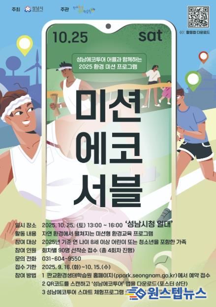 원스텝뉴스 이병희 기자 | 성남시는 오는 10월 25일 오후 1시~4시 시청 곳곳에서 가족 단위 초·중학생 120개 팀(팀당 2~4명, 총 360명)이 참여하는 ‘미션에코서블’ 프로그램을 진행한다.