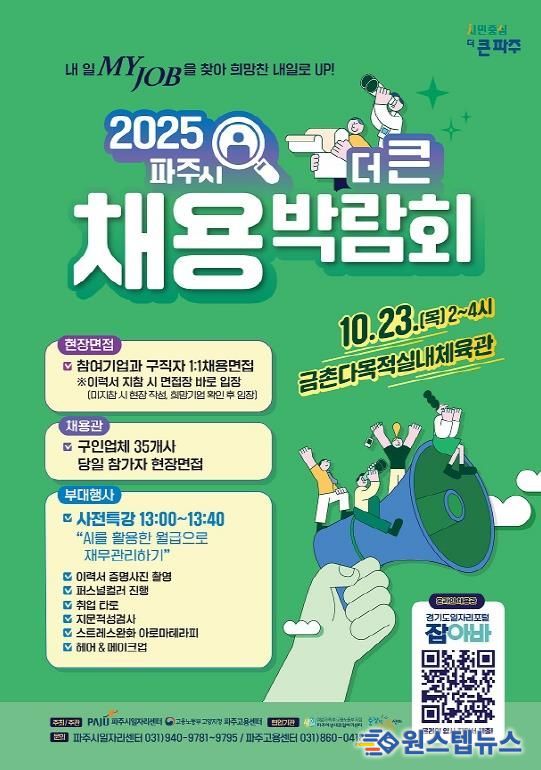원스텝뉴스 천규영 기자 | 파주시는 오는 10월 23일 금촌다목적실내체육관 2층에서 ‘2025년 파주시 더 큰 채용박람회’를 개최한다고 밝혔다. 이에 앞서 행사에 참여할 구직자를 10월 1일부터 17일까지 모집한다.