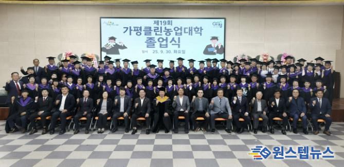 원스텝뉴스 이병희 기자 | 가평군은 9월 30일 가평군농업기술센터에서 ‘제19회 가평클린농업대학 졸업식’을 열었다. 이날 행사에는 서태원 군수를 비롯해 지역 기관·단체장, 내빈, 졸업생과 가족 등 100여 명이 참석해 졸업을 축하했다.