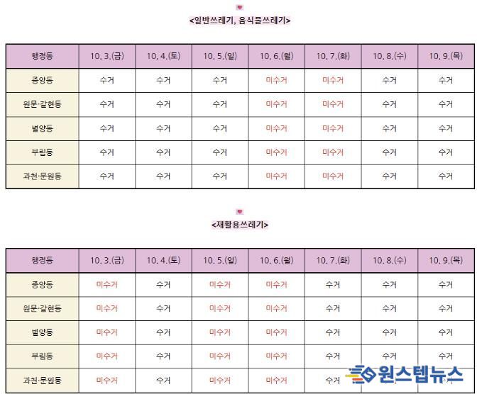 생활폐기물 수거는 일반 쓰레기의 경우 3일, 4일, 5일, 8일, 9일에, 재활용 쓰레기는 4일, 7일, 8일, 9일에 각각 수거된다.