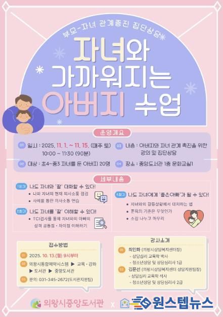 원스텝뉴스 이병희 기자 | 의왕시 중앙도서관은 사춘기 자녀와의 관계에서 어려움을 겪고 있는 아버지를 위한 부모 집단상담 프로그램 ‘자녀와 가까워지는 아버지 수업’을 운영한다.