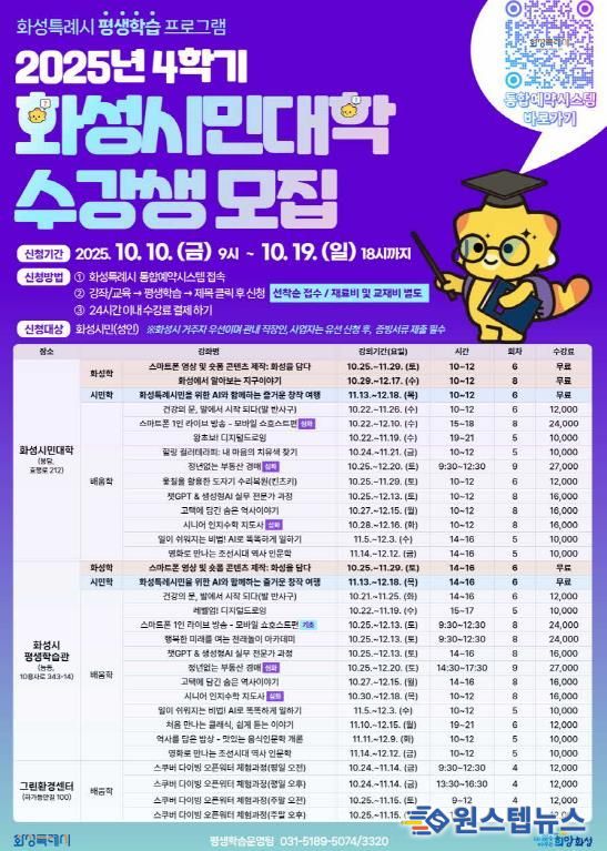 원스텝뉴스 이병희 기자 | 화성특례시가 오는 19일까지 2025년 화성시민대학 4학기 수강생을 선착순 모집한다고 1일 밝혔다.