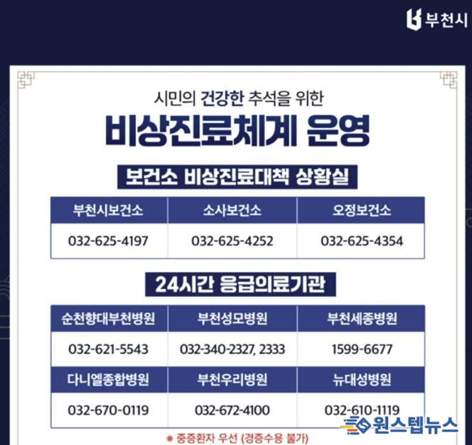 원스텝뉴스 이병희 기자 | 부천시는 추석 연휴 동안 진료 공백을 최소화하기 위해 관내 의료기관과 약국의 협력으로 비상 진료체계를 운영한다.